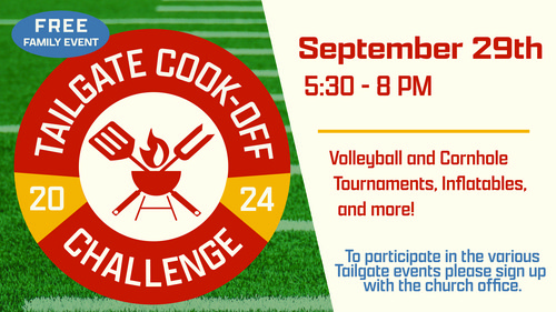 Sunday evening September 29 will be our annual Tailgate Cookoff. This is an event for the whole family. The event starts at 5:30 pm and there will be many different foods to try along with a corn hole tournament, 4v4 volleyball tournament and inflatables for the kids. This year the cooking competition will include a sweet and savory category. You may enter either one or both. To sign up for the cooking competition please contact the church office or email Jeff Kimes jkimes@chbcmustang.org and let us know what you will be cooking. You can sign up for the corn hole and volleyball tournaments the day of the event.